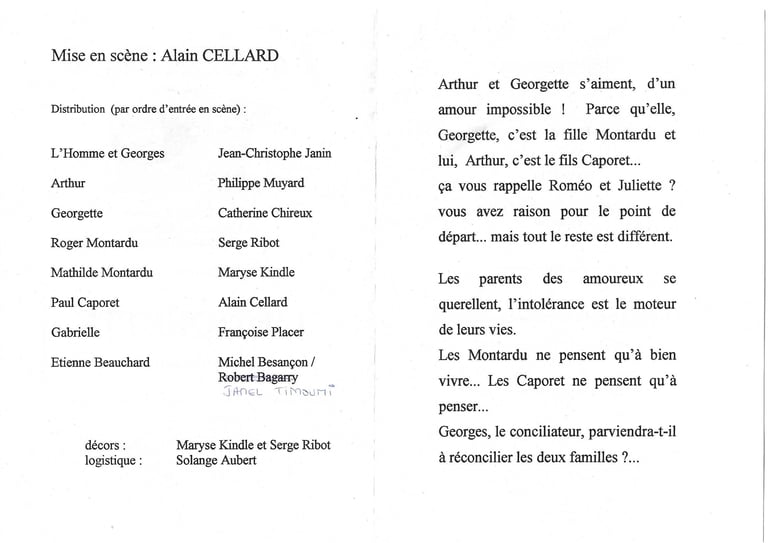 Arthur et Georgette s’aiment. Amour unique. Amour sublime. Amour de légende… Mais amour impossible. Pourquoi impossible ? Parce qu’elle, Georgette, c’est la fille Montardu et que lui, Arthur, c’est le fils Caporet. Ça vous rappelle Roméo et Juliette ? Vous avez raison : c’est le même point de départ… mais tout le reste est différent. En effet les Montardu, qui ne pensent qu’à bichonner leur voiture, à bien manger, bien boire, bien vivre, ne tolèrent pas que les Caporet aient des aspirations tout autres. Et les Caporet, qui, eux, « ne pensent qu’à penser », ne tolèrent pas que les Montardu ne soient pas de purs intellectuels comme eux.