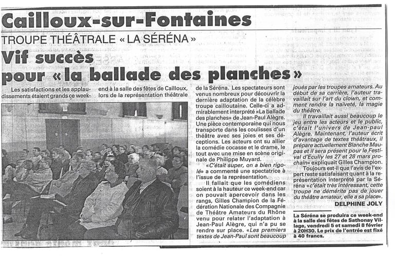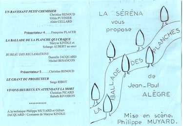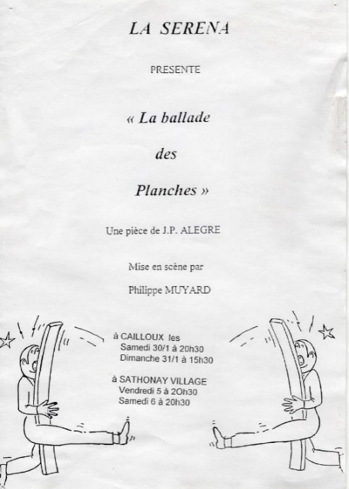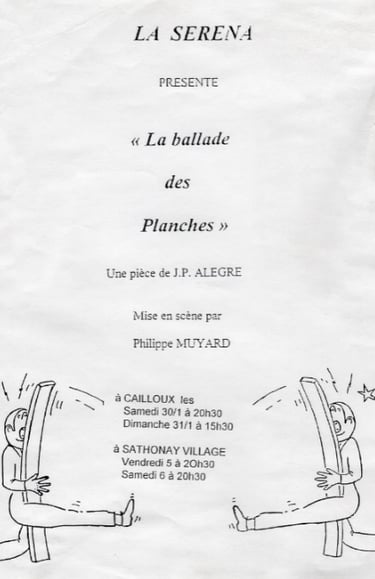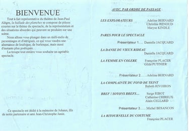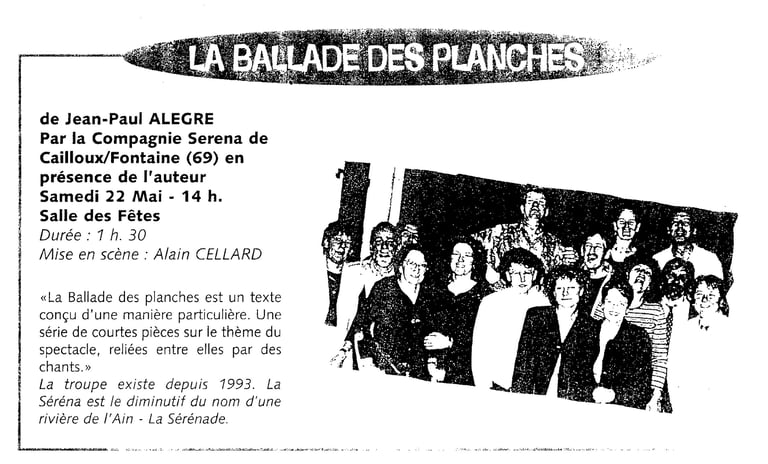 En une série de courtes pièces, La Ballade des planches visite l’univers du théâtre. Au rythme des saisons théâtrales s’enchaînent les scènes de répétitions des comédiens, les derniers préparatifs avant de monter sur les planches, les ultimes raccords d’un metteur en scène capricieux mais aussi la complainte d’un tube de fond de teint égaré, la danse d’un vieux rideau affolé, d’un costume ensorcelé et de bien d’autres accessoires encore…