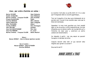 La vocation n'est plus ce qu'elle était et il n'y a plus que 4 religieuses dans ce couvent gigantesque... Tout est tranquille et les deux gros évènements de la journée sont l'accueil d'une nouvelle sœur ainsi que le bilan de la kermesse. Cependant, le train train quotidien qui s'est installé dans ce lieu de prière va être bouleversé par l’arrivée d’Issenlieu qui se déclare maître de la propriété qu’il a l’intention de raser pour y construire un centre commercial révolutionnaire.