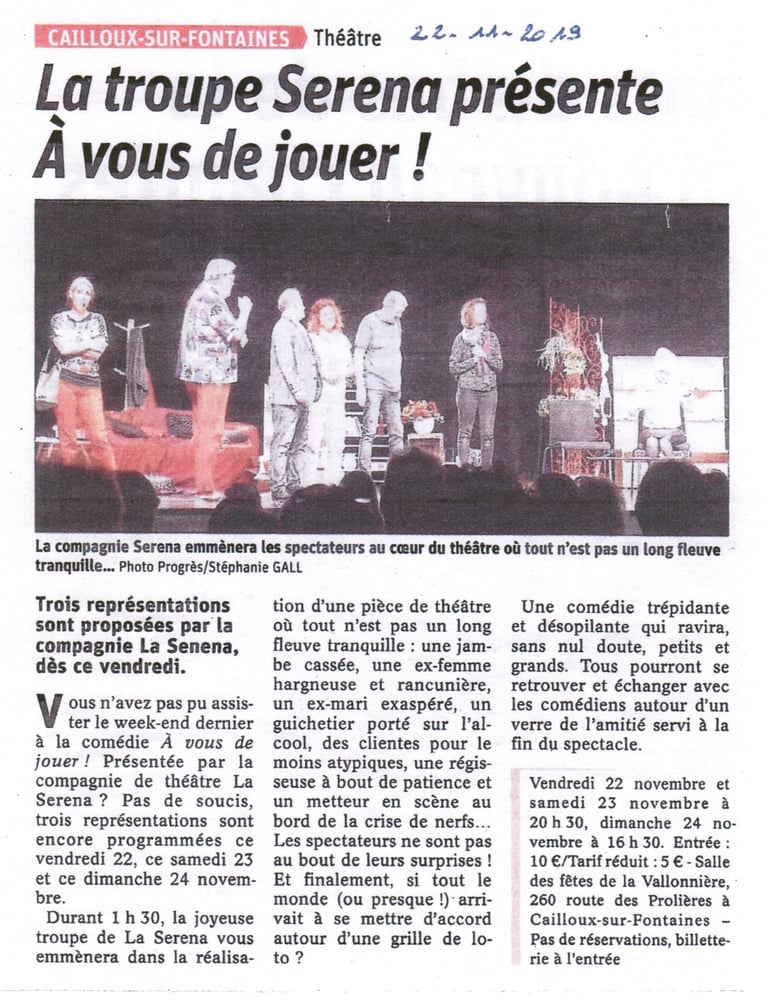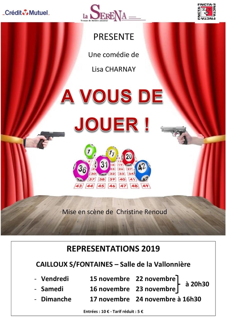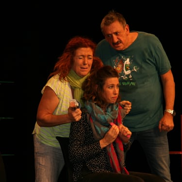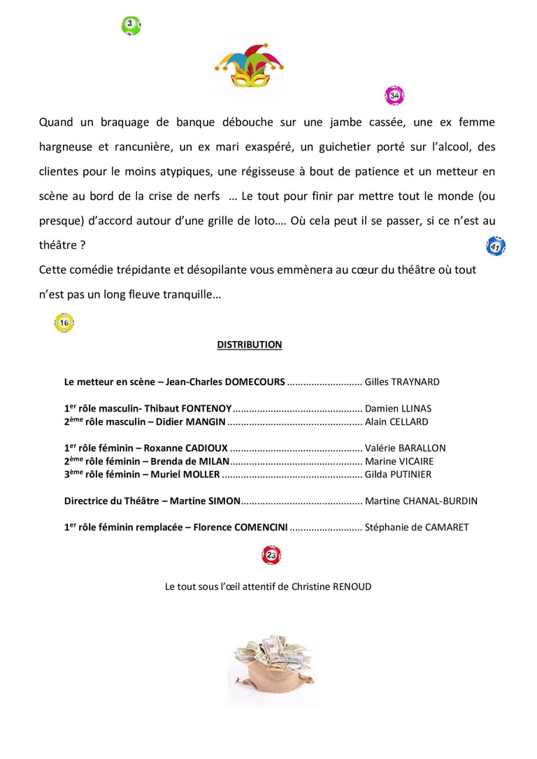 Quand un braquage de banque débouche sur une jambe cassée, une ex-femme hargneuse et rancunière, un ex-mari exaspéré, un guichetier porté sur l’alcool, des clientes pour le moins atypiques, une régisseuse à bout de patience et un metteur en scène au bord de la crise de nerfs … Le tout pour finir par mettre tout le monde (ou presque) d’accord autour d’une grille de loto…. Où cela peut il se passer, si ce n’est au théâtre ? Cette comédie trépidante et désopilante vous emmènera au cœur du théâtre où tout n’est pas un long fleuve tranquille.