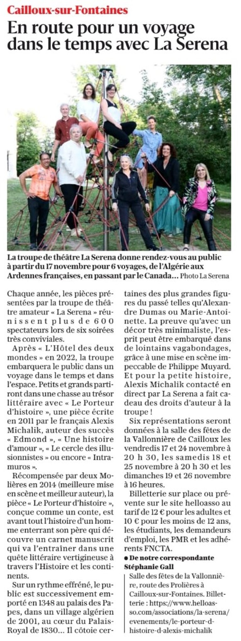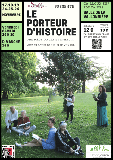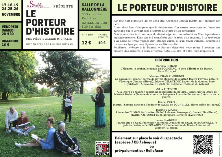 Le Porteur d’histoire relate des histoires liées à la disparition légendaire d'une famille noble sous la Révolution française. Un fabuleux trésor pourrait être trouvé par celui ou celle qui résoudrait l'énigme. La pièce se joue sur une vingtaine de tableaux croisés.